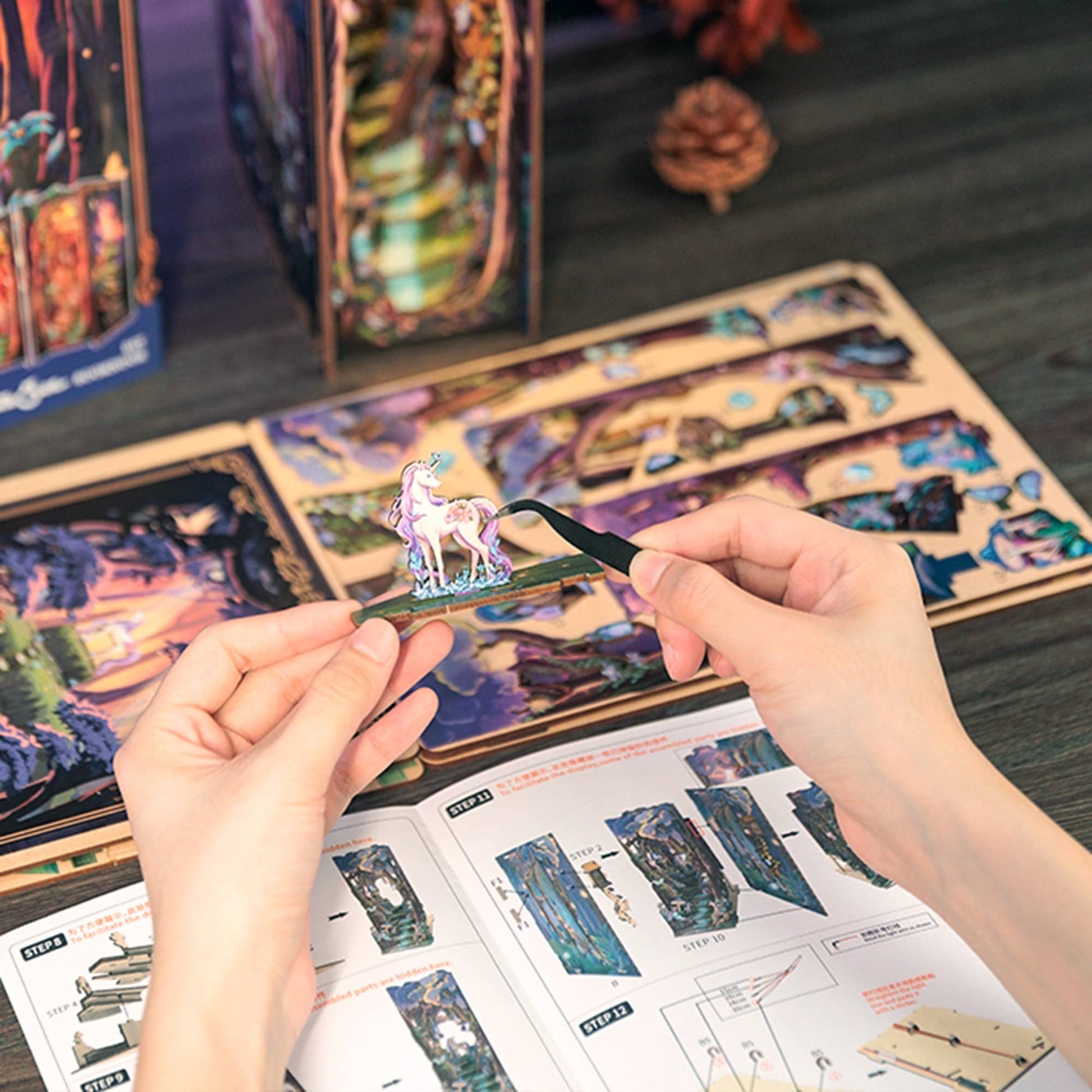 Step into a realm of magic and wonder with this enchanting DIY Book Nook Kit, set in a mythical forest where fantasy and nature intertwine. At the heart of this serene woodland stands a majestic unicorn, bathed in a soft, ethereal light from behind, casting a gentle glow that highlights its graceful form. Surrounded by ancient trees, delicate flowers, and glowing fungi, this enchanting scene evokes the feeling of a hidden, otherworldly sanctuary.